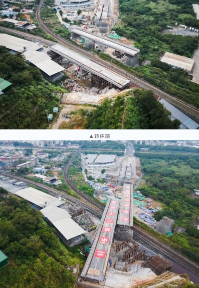 當(dāng)天7時(shí)04分,轉(zhuǎn)體橋梁開(kāi)始轉(zhuǎn)體,經(jīng)過(guò)44分鐘施工,成功完成高空“二人轉(zhuǎn)”,為下一步順利實(shí)現(xiàn)通車(chē)運(yùn)營(yíng)奠定堅(jiān)實(shí)基礎(chǔ)。轉(zhuǎn)體橋上跨既有漳龍線(xiàn)、龍東線(xiàn)及煤場(chǎng)專(zhuān)用線(xiàn)3條鐵路貨運(yùn)營(yíng)業(yè)線(xiàn),距離營(yíng)業(yè)線(xiàn)最近距離僅5.9米,施工難度大,危險(xiǎn)系數(shù)高。