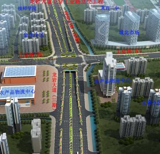 龍巖大道工業(yè)路下穿通道項目位于龍巖大道與工業(yè)路交叉口,為現(xiàn)狀龍巖大道三期道路上設置下穿通道,起始于規(guī)劃支路農(nóng)產(chǎn)品物流配送中心路口,終止于龍巖大道四期龍巖第一技師學院東側(cè),全長383米,其中框架涵長度80米,U型槽長度303米,地道凈寬2×13米,雙向六車道。主通道兩側(cè)設置兩道南北向人行地下通道,人行通道斷面型式:5×3.5米,主通道長124米,梯道長128米,總投資約2億元。