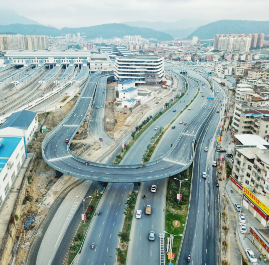 該項(xiàng)目屬于火車(chē)站北片區(qū)“一橫一縱一環(huán)”路網(wǎng)中的一環(huán),是火車(chē)站北站房片區(qū)的重點(diǎn)工程,也是連接羅龍路與火車(chē)站北站房旅客出發(fā)平臺(tái)的唯一通道,項(xiàng)目建成對(duì)完善片區(qū)功能開(kāi)發(fā)需要具有重要意義。1月1日起,站前高架橋已順利通車(chē),前往出發(fā)層的市民可從高架橋進(jìn)入北站房,而到站旅客將從廣場(chǎng)出站,進(jìn)出分流,交通疏導(dǎo)更加順暢。