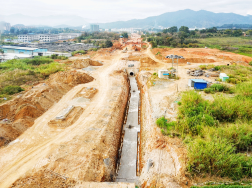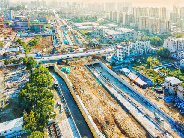2017年9月開(kāi)工。目前,下穿車(chē)型通道U型槽、箱型通道、排洪溝主體已完成,管廊主體結(jié)構(gòu)已完成45米